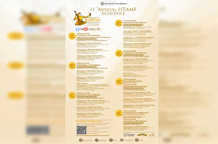 Hyderabad Tyagaraja Aradhana Music Festival (HTAMF) will enter its 11th edition in January 2026, marking a major milestone in its journey as one of the world’s largest Tyagaraja Aradhana celebrations. The festival will be held at CCRT and Shilparamam, Hitec City, Hyderabad, from January 19 to January 25. The event is initiated and organised by Sanskriti Foundation, a Hyderabad-based non-profit organisation, and is entirely volunteer-driven.