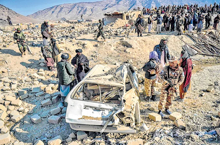 Taliban security personnel inspect a damaged car two days after air strikes by Pakistan in the Barmal district of eastern Paktika province —AFP