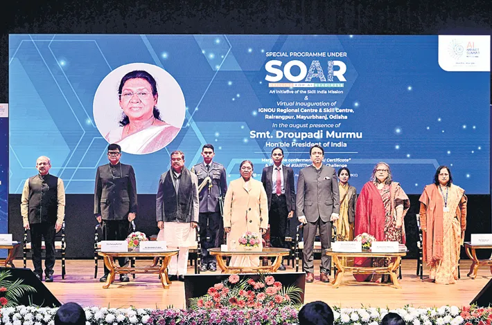Participating in the SOAR (Skilling for AI Readiness) initiative under the Skill India Mission, the President awarded AI certificates to students and Members of Parliament. She also virtually inaugurated the IGNOU Regional Centre at Rairangpur, which will serve as a key hub in northern Odisha to strengthen employability through skill-oriented training programmes.