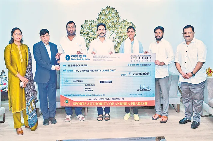 State Minister Nara Lokesh handed over a cheque of Rs 2.5 crore to cricketer Sricharani the left-arm spinner from the state who played a pivotal role in India's 2025 Women's Cricket World Cup victory, as a cash incentive on behalf of the state government.