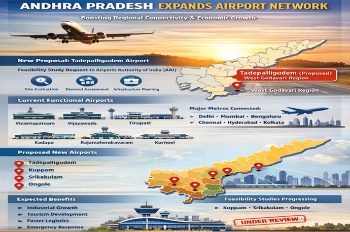 The Andhra Pradesh government has stepped up efforts to expand the state’s airport network, focusing on improved access to Tier-2 cities, industrial hubs and emerging tourism centres. As part of this strategy, the state government has formally requested the Airports Authority of India (AAI) to conduct a feasibility study for establishing a new airport at Tadepalligudem, a move aimed at improving connectivity in the West Godavari region.