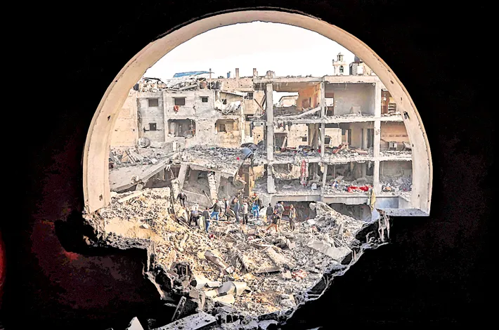 Cold hand of baby Sila, and Palestinians inspect the damage in Gaza City's al-Zaitoun neighbourhood on Thursday —AFP