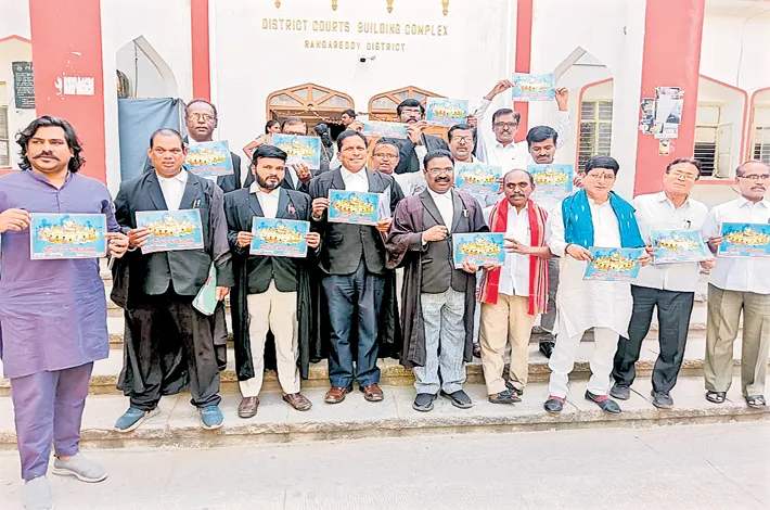 The BC Lawyers Association Telangana and BC Intellectual Forum unveiled on Friday at the Rangareddy District Court the poster of the BC Jana Bhojana which would be held on 28th of this month from 10 am to 5 pm at Ananya Resort, LB Nagar. Chamakura Raju and his team from BC Intellectual Forum came to Rangareddy District Court to invite BC Lawyers from Telangana for this BC Janabojana program. Ponnam Devaraj Goud, General Secretary of BC Lawyers Association and Raju Yadav, Calf Narasimha, Dukuntla Sridhar and many other lawyers participated in this event.