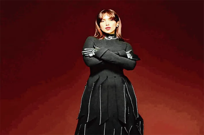 Subtle white topstitching along the panels created contrast, making the outfit visually striking and artistic. Bhumi accentuated the look with bold diamond accessories, including a statement necklace, edgy ear cuffs and a bold oversized ring from Swarovski.