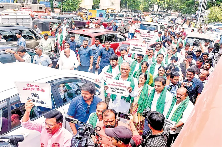 BRS MLAs staged a protest on the premises of the Telangana Legislative Assembly over the severe shortage of urea.