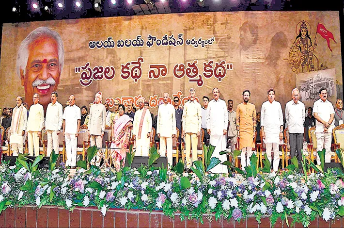 Andhra Pradesh Chief Minister N. Chandrababu Naidu described the occasion as special, praising Dattatreya as a true gentleman and Ajatashatru. He traced his rise from a dedicated Swayamsevak to a national leader devoted to jana hitam (people’s welfare) and mathala samarasyam (communal harmony). Naidu also recalled Dattatreya’s humanitarian efforts during the 1977 cyclone and his close associations with prominent leaders like Modi, Amit Shah, Vajpayee, and Advani.