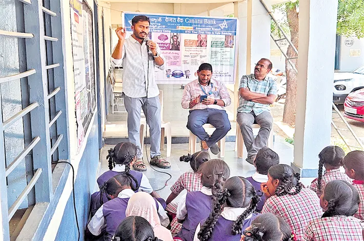 A financial awareness camp was organized by officials of the Gangasthan branch of Canara Bank at the Zilla Parishad High School in Mubarak Nagar, located in Nizamabad city, as per the instructions of Canara Bank Nizamabad Regional Head K. Vinod Babu.