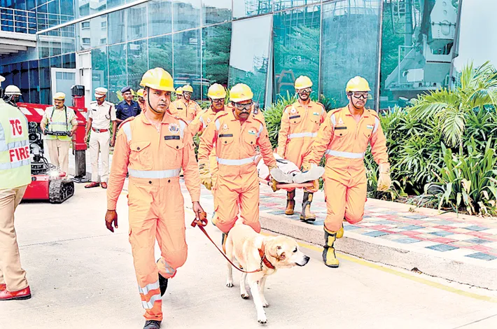 A fire mock drill was conducted at the Telangana State Police Integrated Command & Control Centre (TG ICCC) building in Banjara Hills, Hyderabad on Monday, under the supervision of TG ICCC Director V B Kamalasan Reddy, IPS (Retired). Various departments participated, including the Fire, Medical, Municipal, NDRF, R&B, Electricity, Water Works, Hyderabad City Police, and 108 Ambulance Services.