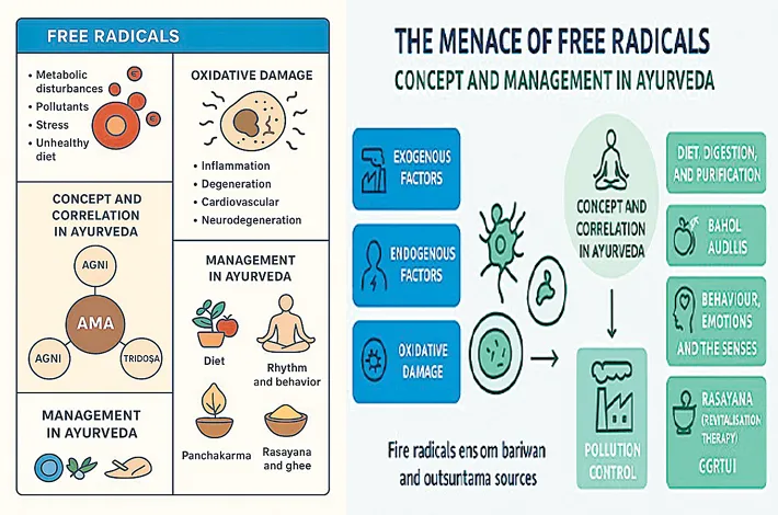 The strength of the enzymatic activities at the cellular level (dhatwagni) depends upon the central gastrointestinal metabolic factors (jatharagni) and the defence mechanism (ojabala) depends upon the proper digestion of the nutritive elements, their uninterrupted delivery to the target cells which subsequently results into the replenishment of the body tissues. The management of free radicals aims at correcting both internal and external environment of the body to become unison with the nature.