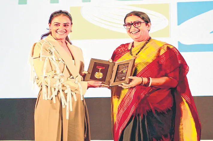 Genelia Deshmukh gets felicitated by Smiriti Irani at MEWA India 2025 for Imagine Foods