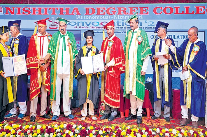 The Graduation Day Ceremony of Nishitha Degree College Nizamabad was held on Wednesday at Shravya Gardens. The Chief Guest of the event was Prof. V. Bala Kista Reddy, Chairman of Telangana Council of Higher Education, Prof T. Yadagiri Rao, Vice Chancellor of Telangana University, Nizamabad and Prof. M. Yadagiri, Registrar, Telangana University. Degrees were handed over to the students by the guests.