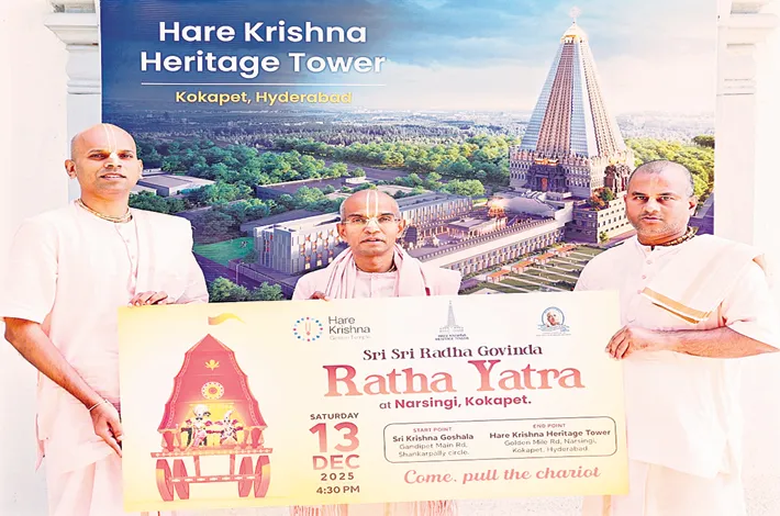 The Hare Krishna Movement, Hyderabad, announced on Wednesday its 4th Annual Sri Sri Radha Govinda Ratha Yatra to be held on Saturday, December 13, 2025, celebrating India’s timeless spiritual and cultural heritage. This sacred procession will feature the adorned deities of Sri Sri Radha Govinda traveling from Sri Krishna Go Seva Mandal Goshala, Gandipet “Y” Junction, to the Hare Krishna Heritage Tower, Narsingi–Kokapet, accompanied by devotional music, worship, and large-scale community participation.