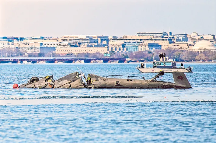 Wreckage of the jet on river Potomac on Thursday. The two aircraft fell into the river after the collision, While the passenger plane broke into several pieces, the military helicopter unturned upside down and sank —AP/PTI