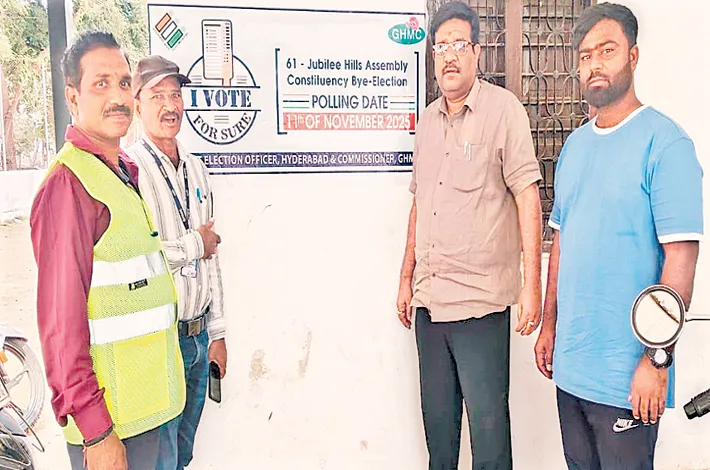 As part of the SVEEP program, election officials have launched a special campaign titled "I VOTE FOR SURE" to raise awareness among voters regarding the Jubilee Hills Assembly constituency by-election to be held on the 11th of next month. As part of this program, "I VOTE FOR SURE" stickers with the polling date were pasted at GHMC circle offices, ward offices, GHMC sports complex, fair price shops, and ICDS centers.