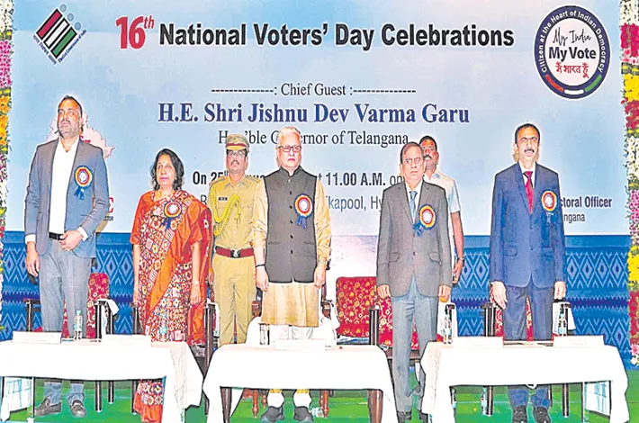 Governor Jishnu Dev Varma said the independence and impartiality of the ECI were central to ensuring free and fair elections in a diverse and populous nation. Quoting Dr. B.R. Ambedkar and Mahatma Gandhi, he emphasised that political democracy could endure only when supported by social democracy and ethical participation by voters. Addressing the state-level celebrations of the 16th National Voters’ Day at Ravindra Bharathi here on Sunday, the Governor said the theme “My India, My Vote” reflected the foundational principle that citizens are at the heart of Indian democracy.