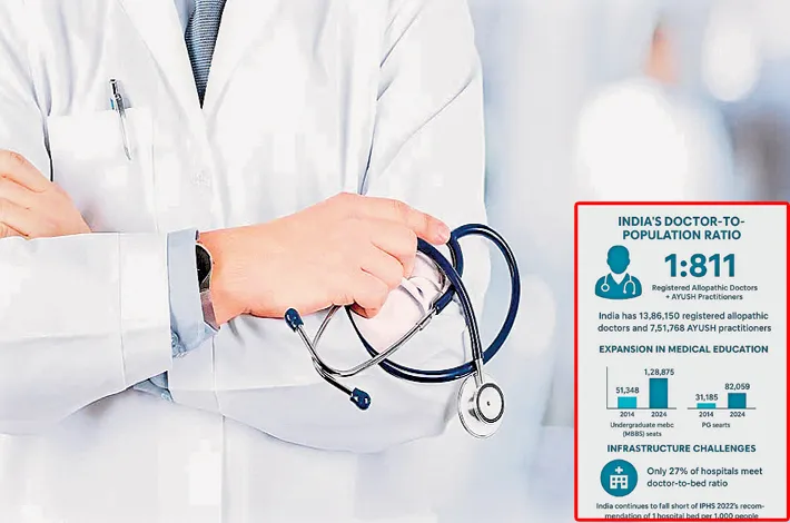 India currently has about one doctor for every 811 residents, according to data from the Union Ministry of Health and Family Welfare, indicating a growing workforce but also exposing serious gaps in distribution and infrastructure. Health Minister J. P. Nadda said the country now has 13,86,150 registered allopathic doctors and 7,51,768 AYUSH practitioners. Assuming that 80% of these professionals are actively available, the doctor-population ratio stands at roughly 1:811, better than the World Health Organization’s (WHO) recommendation of one doctor per 1,000 people.