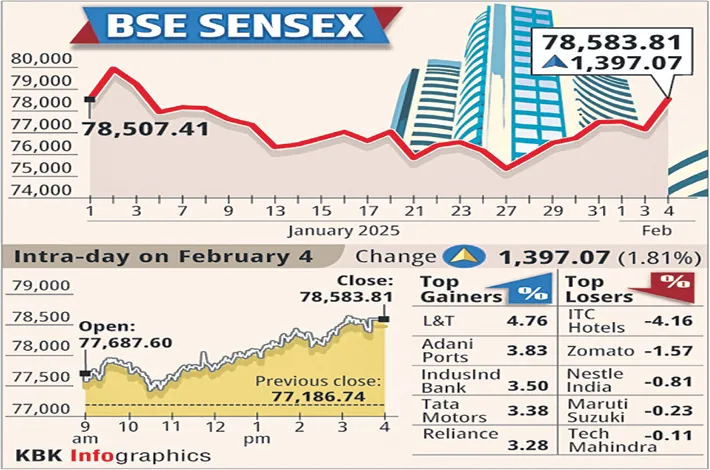 “Sensex and Nifty bounced back, and recorded nearly two per cent in line with a recovery in Asian peers after Mexico and US reached a one-month agreement to stave off tariffs. The 30-share BSE Sensex jumped 1,397.07 points or 1.81 per cent to settle at a month's high of 78,583.81. During the day, it surged 1,471.85 points or 1.90 per cent to 78,658.59. The NSE Nifty soared 378.20 points or 1.62 per cent to 23,739.25, a level not seen since January 3.