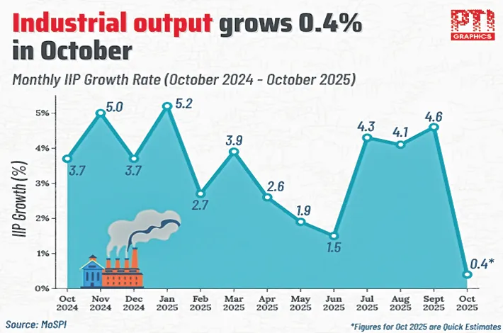 India’s industrial engine lost considerable momentum in October 2025, with the Index of Industrial Production (IIP) expanding by a scant 0.4%, down sharply from 4% in September. The latest figures, released on Monday, mark the slowest pace of industrial growth in 14 months and point to a broad-based moderation across key sectors.