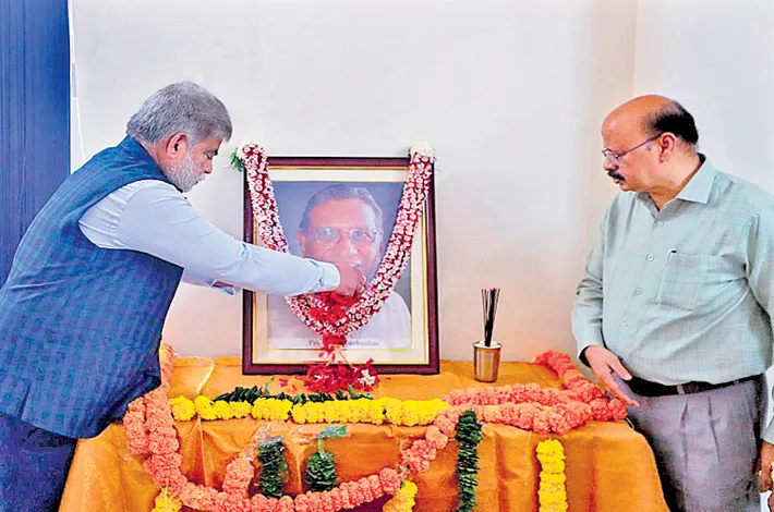 Telangana State Legislative Assembly Speaker Gaddam Prasad Kumar and Legislative Secretary Dr. V. Narasimha Charyulu paid their respects by laying floral tributes at his portrait in the Assembly.