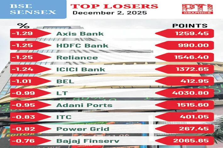 Heavy selling in blue-chip and banking counters dragged the 30-share BSE Sensex down 503.63 points to close at 85,138.27. Earlier in the day, the benchmark slid 588.9 points to a low of 85,053, reversing sharply from Monday’s intra-day peak. The NSE Nifty50 declined 143.55 points to end at 26,032.20.