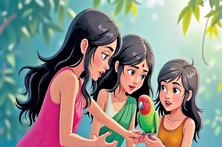 Every day after school, Maya, Lila, and Tara raced to the clinic. They named the parrot Ruby for her bright red crest. Maya brought tiny bits of mango, Lila sang soft songs, and Tara told Ruby stories about the forest. Slowly, Ruby’s eyes grew brighter, and her squawks turned into cheerful chirps. The girls’ hearts swelled with hope each time they saw her flap her healing wing.