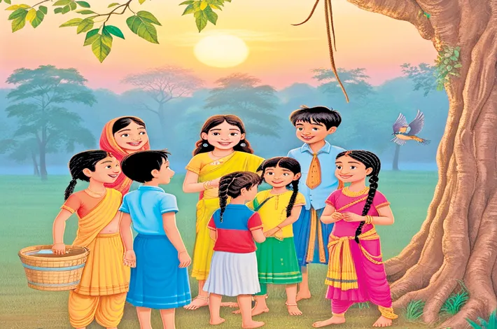That evening, as the sun dipped behind the mango groves, Maya gathered her friends under the old banyan tree. There was Ravi, her cheeky neighbor with a grin wider than the river, always ready for mischief. Priya, the quiet artist who could draw birds that seemed to flutter off the page. Little Arjun, shy as a sparrow but strong as a bullock, who carried water buckets without spilling a drop. And Sita, the bold one with braids like ropes, who knew every folk song by heart.