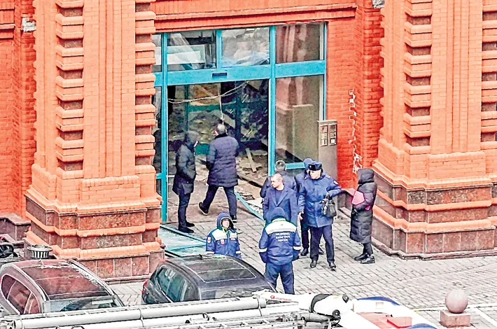 Russian law enforcement officers work in front of the damaged entrance to a residential building following a blast in Moscow on Monday