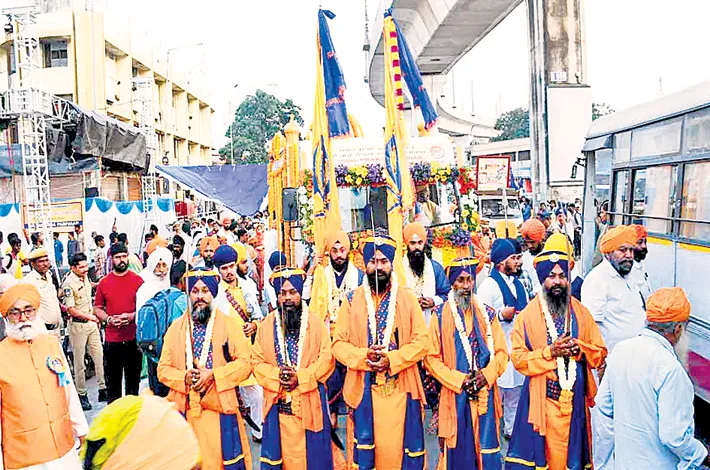 The state capital today witnessed a grand display of devotion during the 'Shaheedi Nagar Kirtan' held to commemorate the 350th martyrdom anniversary of Ninth guru Tegh Bahadur Sahib. The procession, organised by the Shiromani Gurdwara Parbandhak Committee (SGPC), began from Gurdwara Sahib Sikh Chawni at Kishanbagh, and departed towards Vijayawada as part of its nationwide journey. It began from Gurdwara Dhobri Sahib, Assam, reached Hyderabad yesterday evening and today departed from Gurdwara Sahib Barambala, Sikh Chawni, en route to Vijayawada.