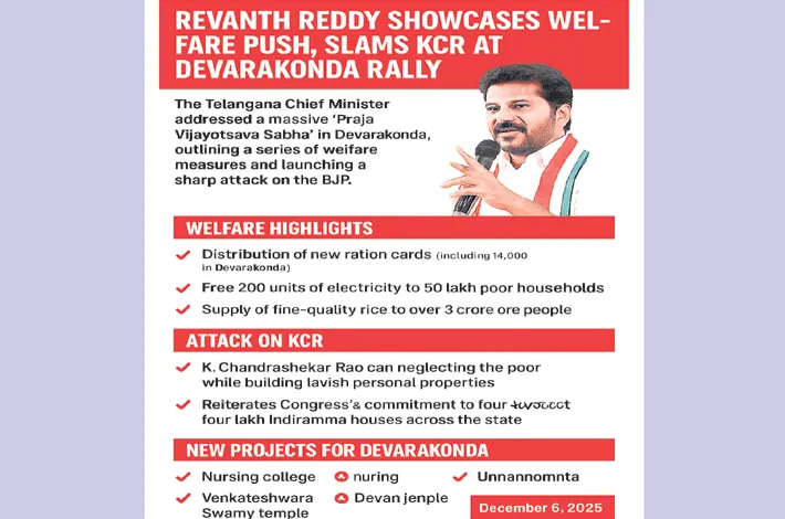 The Chief Minister outlined a series of welfare measures implemented by the Congress government in the last two years. He highlighted the distribution of new ration cards, including 14,000 in Devarakonda alone, free 200 units of electricity to 50 lakh poor households, and the supply of fine-quality rice to more than three crore people. He drew sharp contrasts with BJP-ruled states, stating that Telangana was the only state providing fine rice to all eligible families.