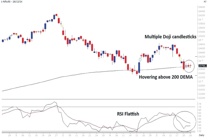 Lack of follow-up buying is seen, which is making the index stuck. Now it has to hold above 23,700 zones for a bounce towards 23,850, and then 24,000 zones whereas supports are seen at 23600, and then 23,500 zones.