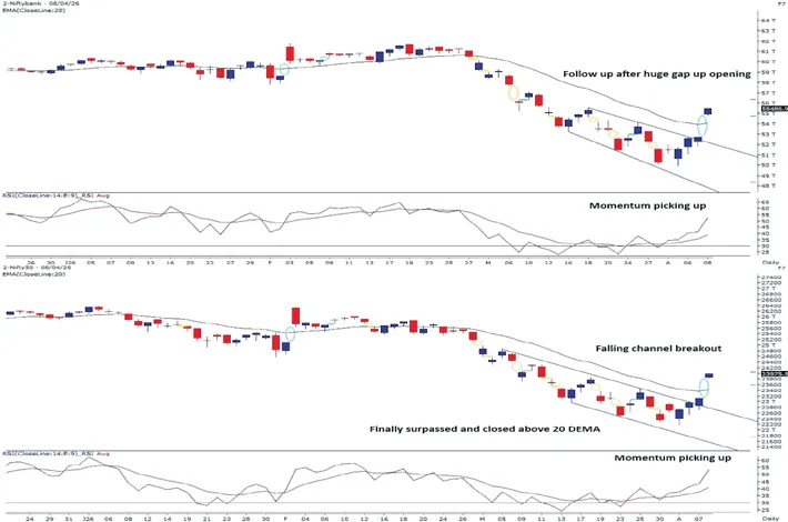 Bank Nifty index opened gap up by more than 2200 points and gradually extended the momentum towards 55750 zones in the latter part of the session. It formed a bullish candle on daily scale as buying interest was visible for most part of the session. The banking index has seen a recovery of almost 5000 points in the last few sessions and it closed above its 20 DEMA. Now it has to hold above 55500 zones for an up move towards 56250 then 57000 levels while on the downside support is seen at 55250 then 55000 levels.