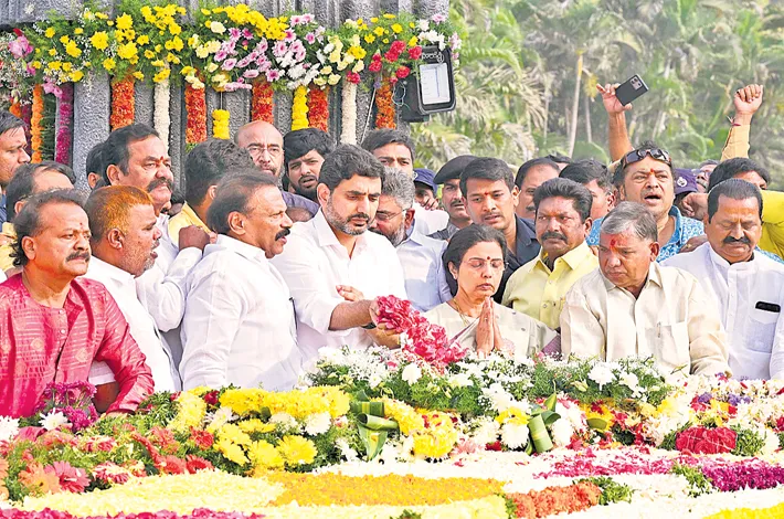 Telugu Desam Party founder and former Chief Minister NTR’s family members, political personalities and fans paid tributes to him on his 29th death anniversary in the city. NTR's sons Nandamuri Balakrishna, Ramakrishna, granddaughter Nandamuri Suhasini, actor Junior NTR Kalyan Ram, AP minister Nara Lokesh, Nara Bhuvaneswari reached NTR ghat and paid floral tributes.