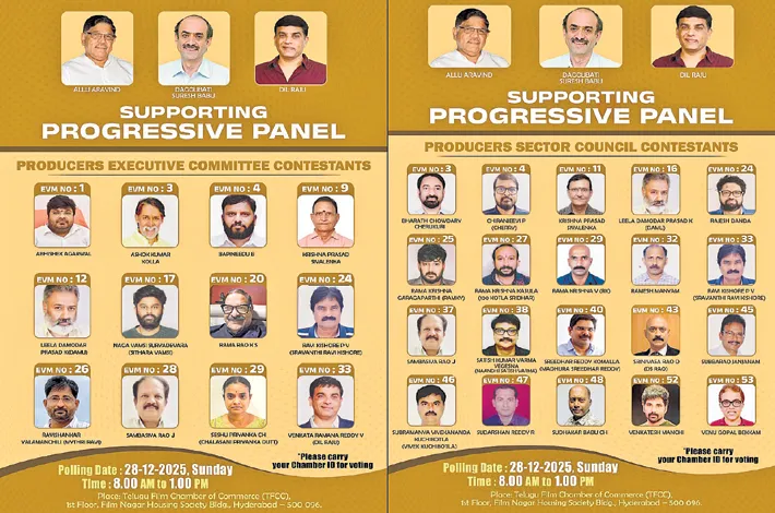 Producer Damodar Prasad clarified that the allegations made against the Guild are untrue, and insisted that there should be no distinction between big films and small films — a film becomes big only when it performs well. The panel expressed concern that elections have been deliberately delayed and stated that those who are actively making films should play a decisive role in the Chamber. Making it clear that to resolve industry issues, unity among producers, responsible leadership and a transparent system are essential, they appealed to extend support to the Progressive Panel for the development of the Telugu film industry.
