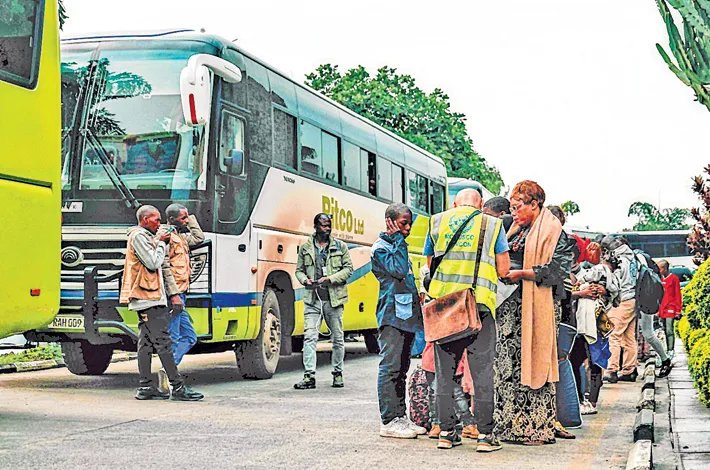 Non-essential UN Organisation Stabilisation Mission in the Democratic Republic of the Congo personnel and families queue near buses as they await evacuation. —AFP