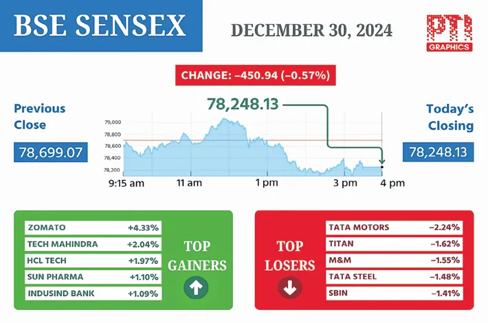 In a volatile trading session, the 30-share BSE barometer dropped by 450.94 points or 0.57 per cent to settle at 78,248.13. As many as 23 of its constituents closed lower while seven closed with gains.