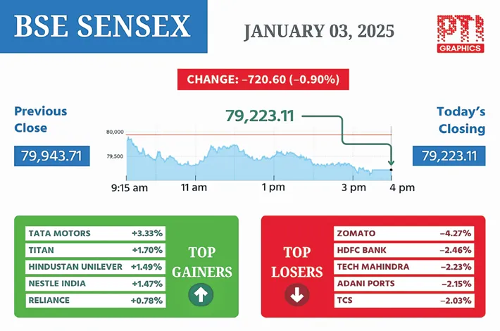 Despite a positive start, the 30-share BSE Sensex tumbled 720.60 points or 0.90 per cent to close at 79,223.11. During the day, it slumped 833.98 points or 1.04 per cent to 79,109.73.