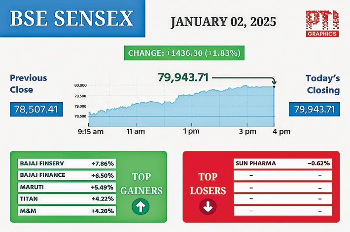The 30-share BSE benchmark Sensex jumped 1,436.30 points or 1.83 per cent – its best single-day gain in more than a month – to settle at 79,943.71. During the day, it soared 1,525.46 points or 1.94 per cent to 80,032.87.