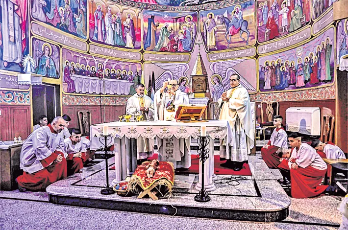 A parish priest of the Roman Catholic Church of the Holy Family conducts Christmas Eve mass at a church in the Zaytoun neighbourhood of Gaza City, on Tuesday —AFP