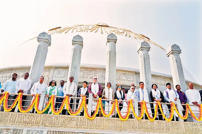 The guests were welcomed at the entrance plaza with traditional Dappu and Kolatam dance performances, creating a lively cultural atmosphere. Mallepalli Laxmaiah, Special Officer of the Buddhavanam Project, along with Dr. E. Sivanagireddy, Buddhist expert and CEO of Pleach India Foundation, guided the delegation through the park. They explored Buddhacharithavanam, the statue of Acharya Nagarjuna in the Maha Stupa, and other intricately designed sections, learning about the historical and cultural significance of each structure.