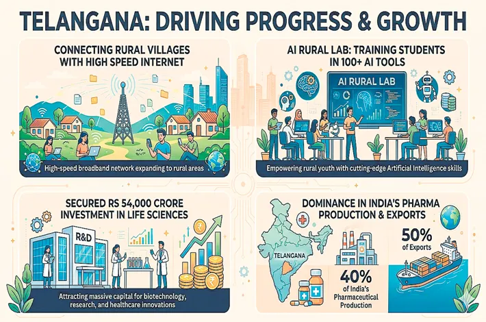 With an investment push of Rs 3,189 crore under the Amended BharatNet Programme, Telangana is building a strong digital backbone. Around 4,800 government institutions have already been connected, generating nearly Rs 70 crore in revenue, and the target is to expand connectivity to 50,000 institutions. The network has also supported major platforms like the Telangana Rising Global Summit, highlighting its importance in governance and economic development.