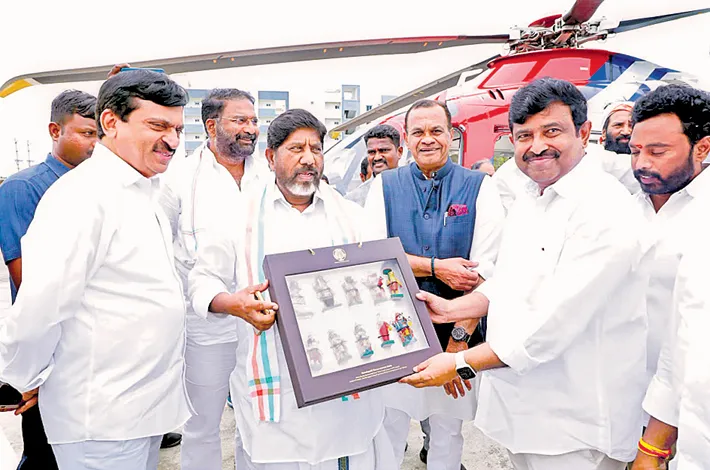 The Telangana delegation, travelling in a special helicopter to attend a private function in the town, included Ministers Uttam Kumar Reddy, Komatireddy Venkat Reddy, and V. Srihari. They were received at the helipad by Andhra Pradesh Jana Sena representatives, Government Whip and MLC P. Hariprasad along with other party leaders extended a cordial welcome.