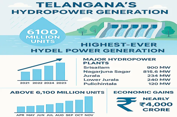 This year’s heavy rains and steady river inflows have given a major boost to Telangana’s power sector, helping the state achieve its highest-ever hydel power generation. Telangana Genco, which began full-scale production with the Krishna river floods in June, has been generating uninterrupted power for nearly six months. With over 6100 million units produced so far, it is now moving toward the 7000-million-unit mark.