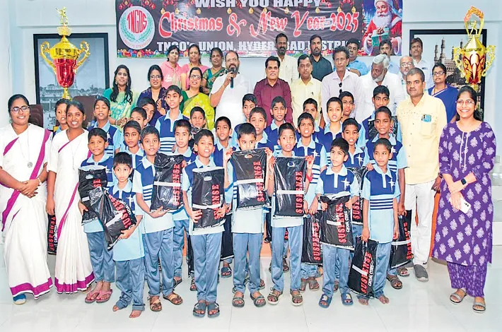 As per the directions of TNGOs Central Association President Maram Jagadishwar and General Secretary Dr S M Hussaini (Mujeeb), Christmas celebrations were grandly organized on Monday under the leadership of Hyderabad District President S Vikram Kumar at the Gruhakalpa office. The program began with a gospel message delivered by former Central Association member B Rachel. Following the cake-cutting ceremony, new clothes and supplies were distributed to 50 children from the Don Bosco Navajeevan Orphanage on behalf of Dr Mujeeb and his family.