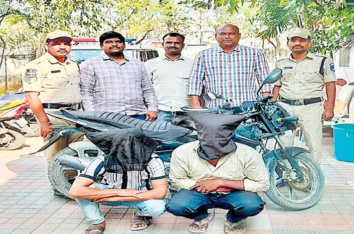 Miyapur Police arrested two men for a theft at JS Wine Mart, Reddy Colony. Maddala Srinivasa Rao, 34, a Rapido driver from Suraram, and Akash Kumar, 22, a mason from Bihar, were taken into custody. Srinivasa Rao is reportedly involved in two other cases under Suraram and Pet-Bhasheerbad police limits.