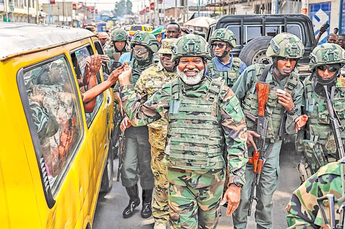 Leader of Alliance Fleuve Congo (AFC), Corneille Nangaa (C), a political-military movement of rebel groups including the M23 group, shakes hands with passengers in a public service taxi as he is received by residents during a clean up excercise of the city of Goma on Saturday —AFP