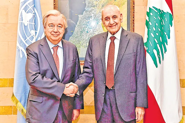 Lebanon's parliament Speaker Nabih Berri (R) and United Nations Secretary-General Antonio Guterres in Beirut on Saturday —AFP