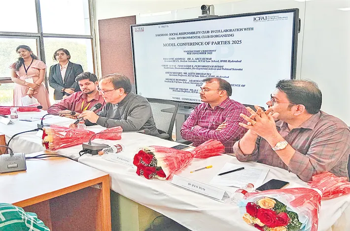 The ICFAI Law School, Hyderabad, under the aegis of Saksham – The Social Responsibility Club and GAIA – The Environmental Club, successfully held the Valedictory Ceremony of the Model Conference of Parties (Model COP) 2025 at the IFHE campus. The three-day event provided a dynamic platform for students to deliberate on global environmental challenges, policy frameworks, and sustainable solutions through simulation-based discussions.