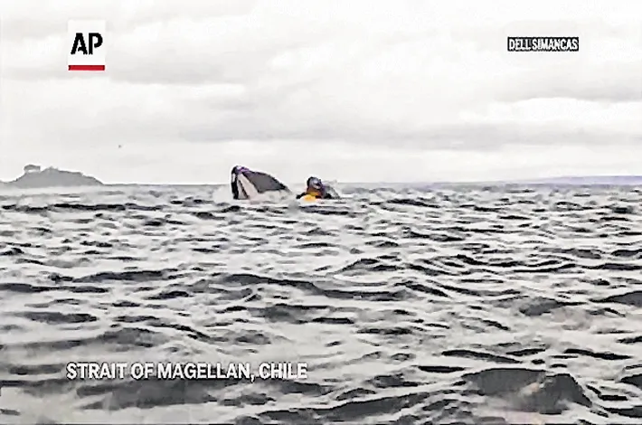 A humpback whale briefly swallowed a kayaker off Chilean Patagonia before quickly releasing him unharmed. The incident, caught on camera, quickly went viral. Last Saturday, Adrián Simancas was kayaking with his father, Dell, in Bahía El Águila near the San Isidro Lighthouse in the Strait of Magellan when a humpback whale surfaced, engulfing Adrián and his yellow kayak for a few seconds before letting him go.