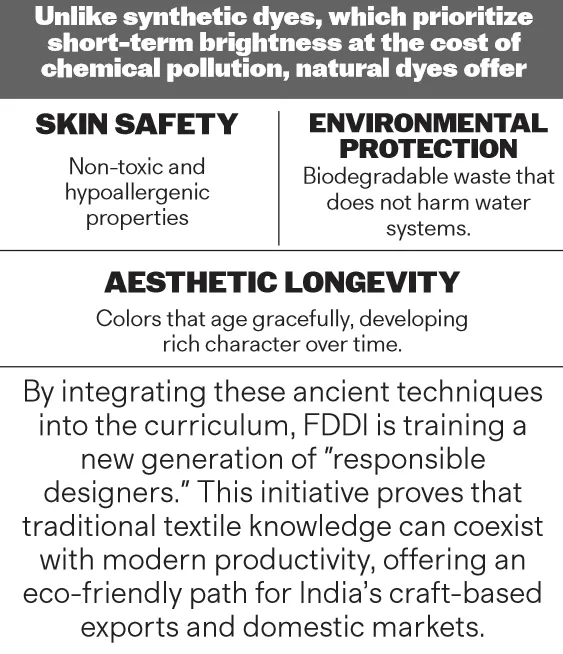 An age-old Indian textile practice is finding a new home in modern academia. The Footwear Design and Development Institute (FDDI) has reintroduced vegetable dye and block printing as essential tools for sustainable design, reconnecting students with India’s rich craft heritage.