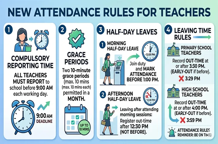 According to the new rules, all teachers must compulsorily report to their respective schools before 9:00 a.m. each working day. Any attendance recorded after the stipulated time will be marked as a “late-in.” The department clarified that only one or two instances of a 10-minute grace period will be permitted in a month, significantly tightening earlier flexibility provisions.
